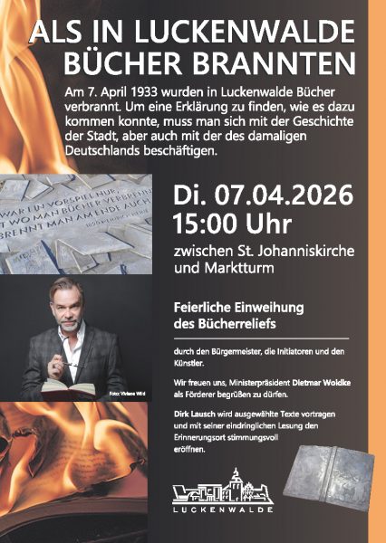 Dienstag, 07.04.2026, 15:00 Uhr. Am 7. April 1933 wurden in Luckenwalde Bücher verbrannt. Um eine Erklärung zu finden, wie es dazu kommen konnte, muss man sich mit der Geschichte der Stadt, aber auch mit der des damaligen Deutschlands beschäftigen. Die Bibliothek hat am 07.04.2023 - 90 Jahre nach der Bücherverbrennung in Luckenwalde - eine Gedenkveranstaltung organisiert und an die verfemten Autorinnen und Autoren erinnert. Auch in dem Zusammenhang ist das Bücherrelief entstanden...