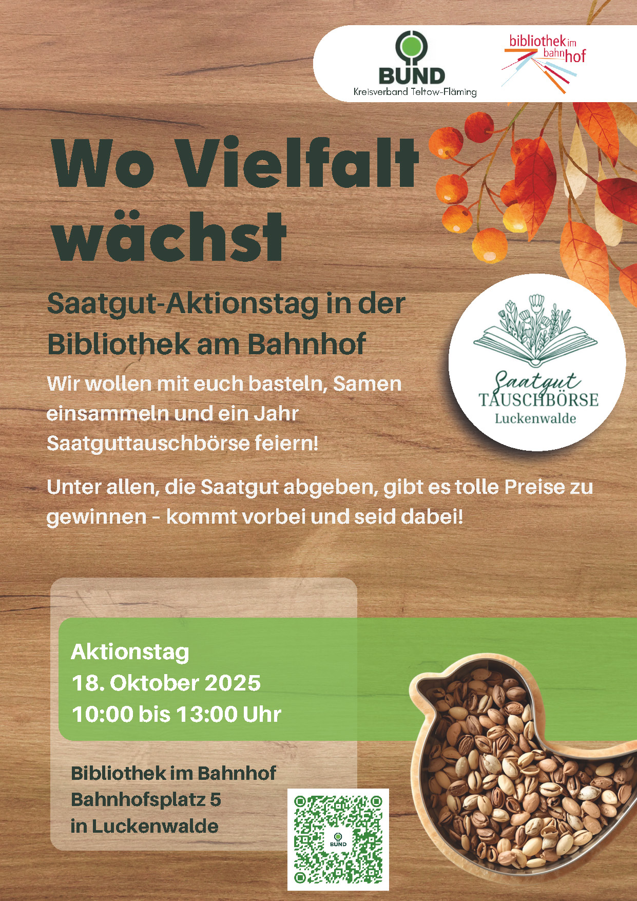 Am Samstag, 18.10.2025 lädt der BUND Kreisverband Teltow Fläming zum Saatgut-Aktionstag ein. Von 10:00 – 13:00 Uhr können Bilderrahmen angefertigt und mit verschiedenen Samen dekoriert werden. In einem Quiz heißt es Samen mit den dazugehörigen Pflanzen zusammenzubringen. Zeit zum Austausch mit dem BUND besteht natürlich auch.